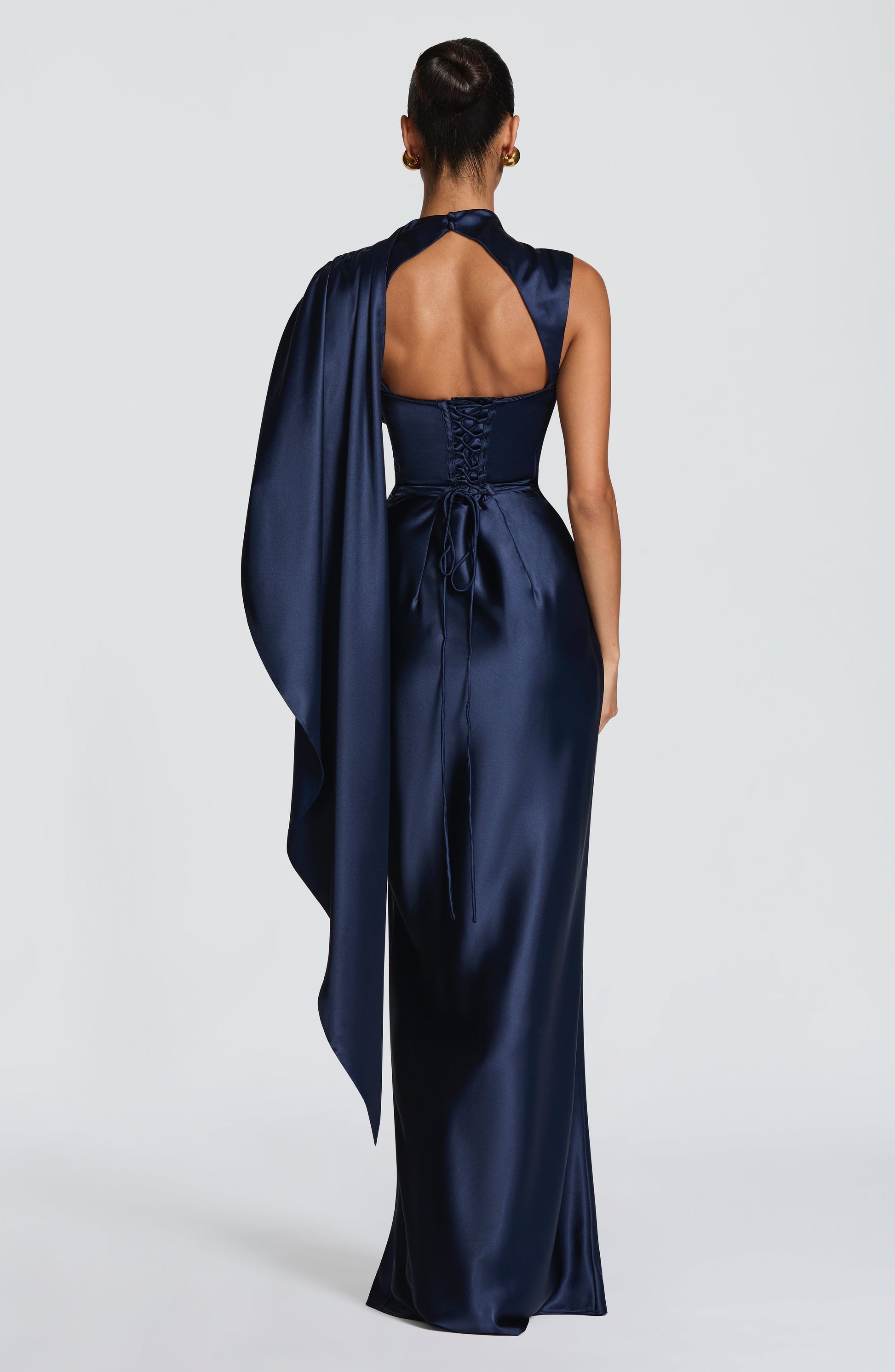 El Avendra Maxi Dress en color azul marino está confeccionado en satén de alta calidad sin elasticidad, creando una silueta elegante y sofisticada. Su escote alto combinado con una capa drapeada asimétrica sobre el hombro izquierdo aporta un estilo moderno y refinado.