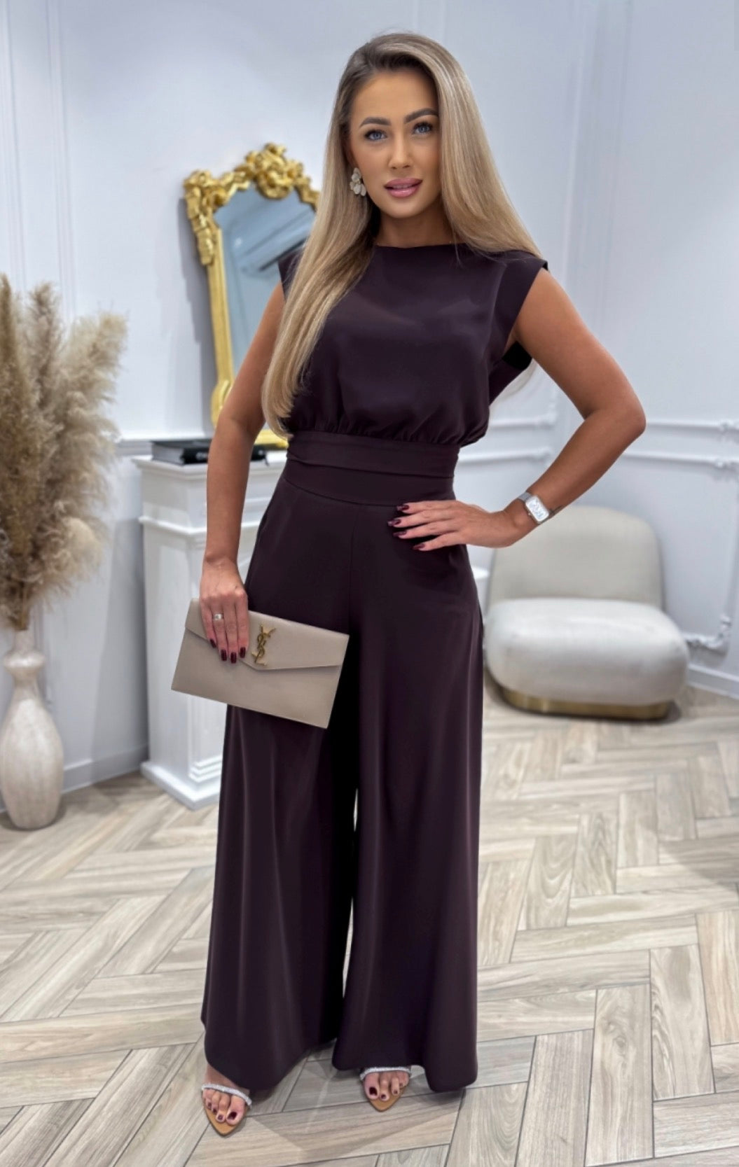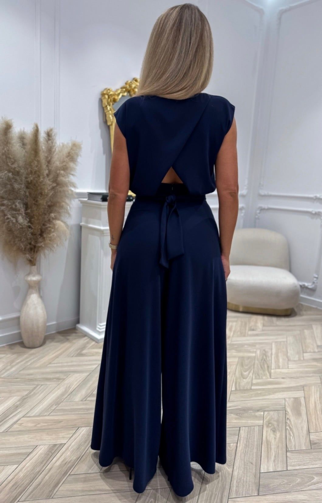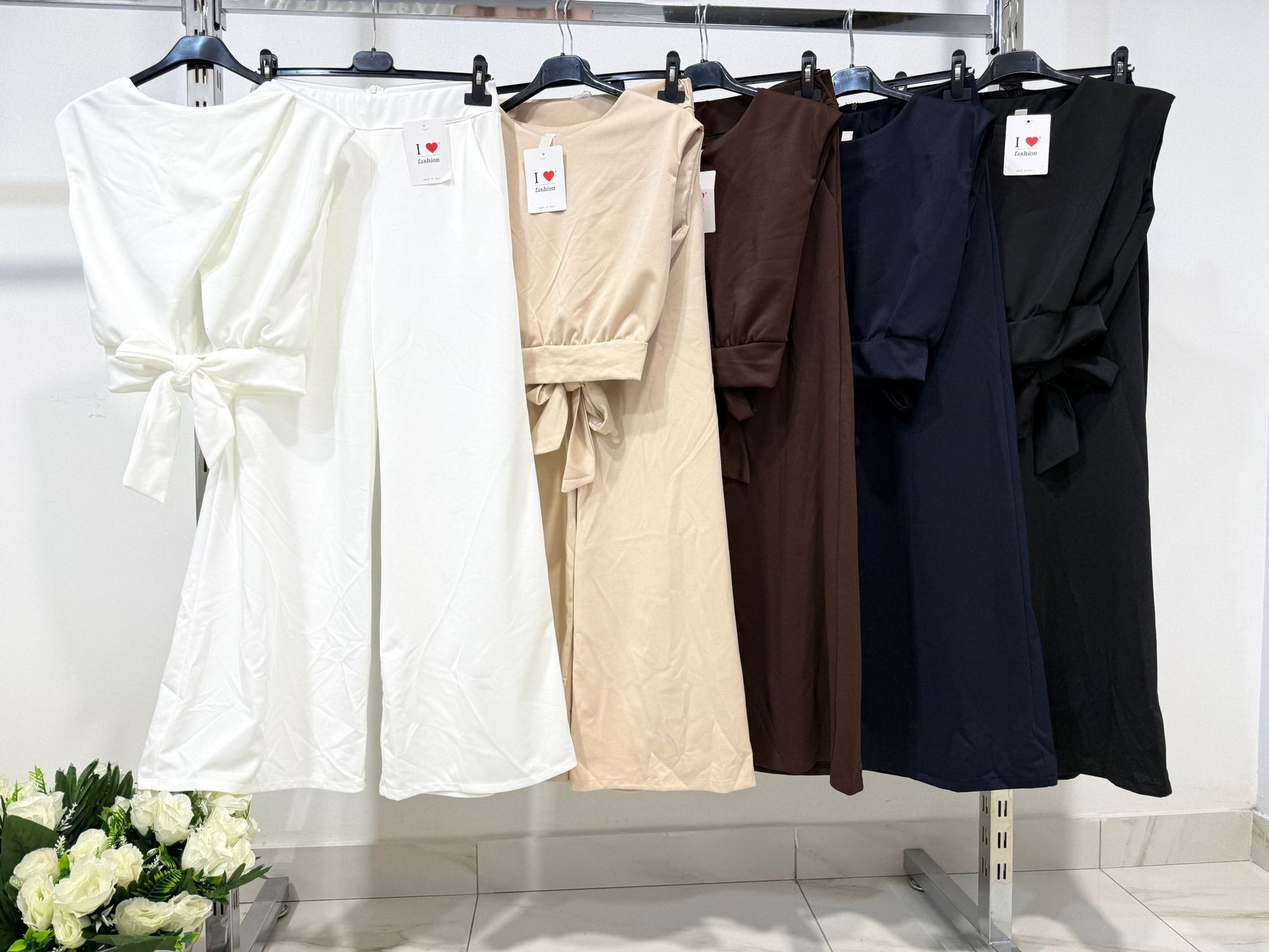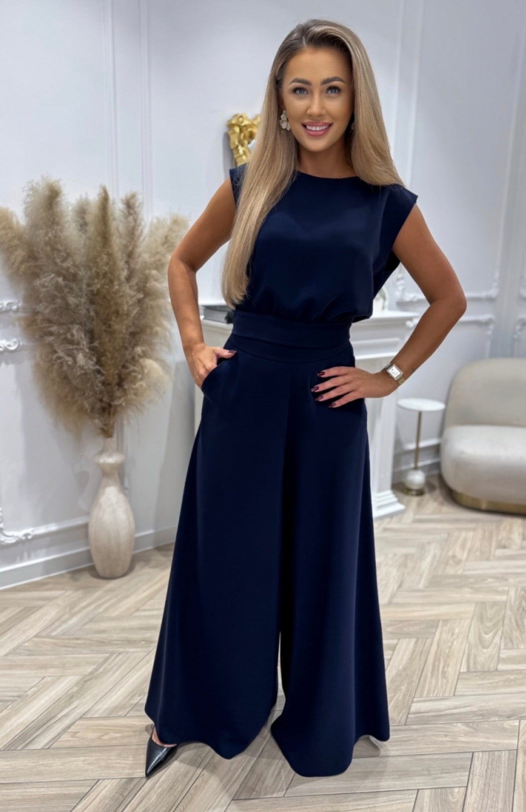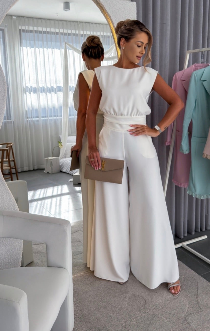 Elegante set coordinato composto da pantaloni a gamba larga e top abbinato, pensato per valorizzare la silhouette con stile e comfort.